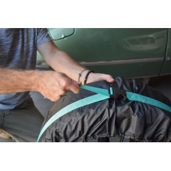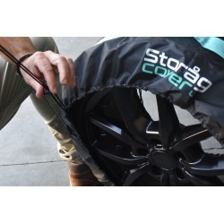 Déplier la housse, choisissez le repère de localisation en fonction du remontage souhaité.Posez la housse au sol en tenant la poignée vers le haut, la boucle ‘sac à dos’ doit être ouverte.Recouvrez la roue et centrez-la housse avant de tirer sur les cordons latéraux.Ajustez la sangle et fermez la boucle ‘sac à dos’. Ajuster une dernière fois les cordons et bloquez-les à l’aide des stops.